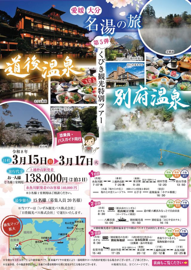 | 日程 | 令和8年3月15日(日)〜17日(火) 2泊3日 ※ 食事(朝2回・昼1回・夕2回) ※ 最少催行15名様(募集人員20名様) |